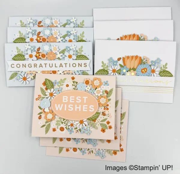 Zachte kleuren, florale accenten en tijdloze teksten zoals Best Wishes, Congratulations, Lieve groet …